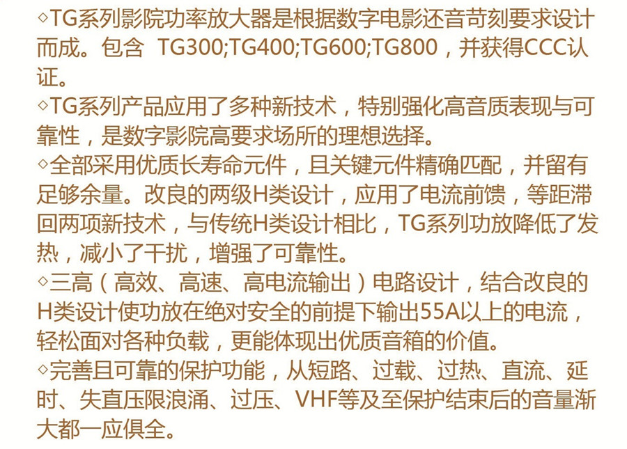 TG系列影院功率放大器是根据数字电影还音苛刻要求设计而成。包含 TG300;TG400;TG600;TG800,并获得CCC认证。